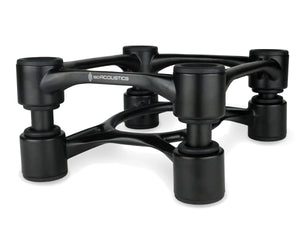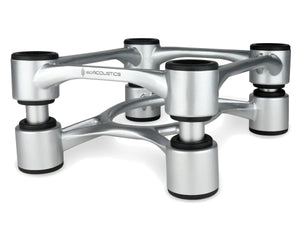 Ce support d'isolation acoustique en aluminium sculpté, élégant et épuré, est conçu pour les moniteurs de studio et les haut-parleurs professionnels de taille moyenne.
